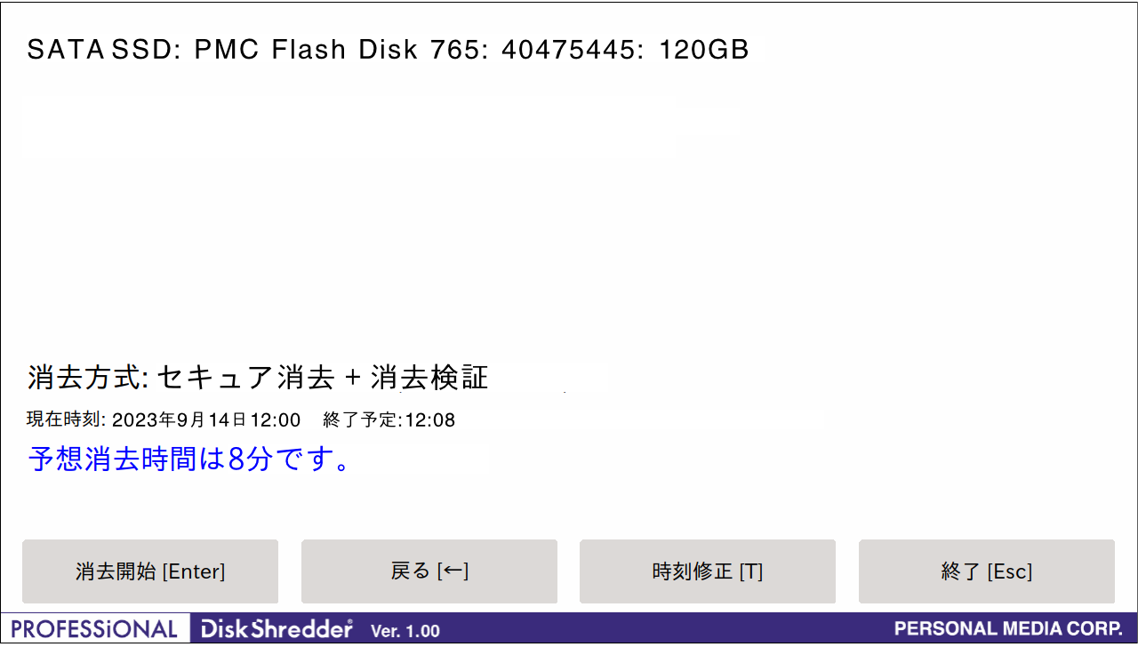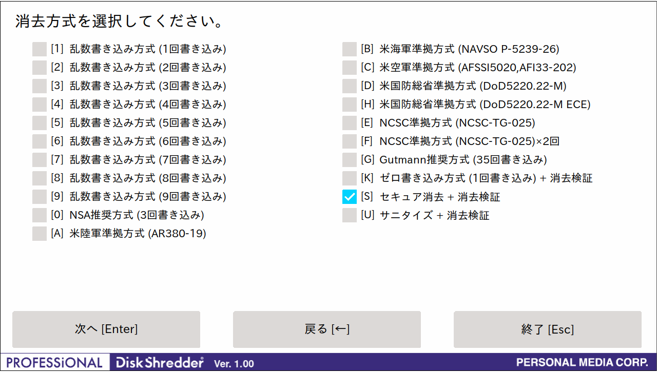 消去方式: 乱数書き込み方式 (1回書き込み)